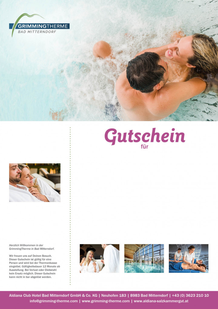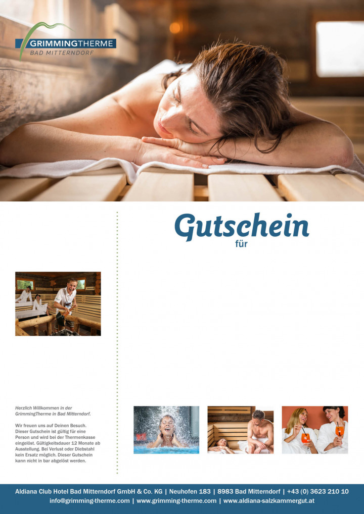 Genieße den ganzen Tag lang die herrliche Thermen- & Saunalandschaft mit Blick auf den Grimming und schlemme anschließend im direkt mit der Therme verbundenen Aldiana Club Salzkammergut.